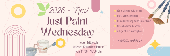 Der Just Paint Wednesday ist unsere ruhige Malzeit für alle, die Keramikmalen bereits kennen und selbstständig arbeiten möchten. Kein Workshop, kein festes Programm – dafür Zeit, Fokus und Raum für deine eigene Kreativität.